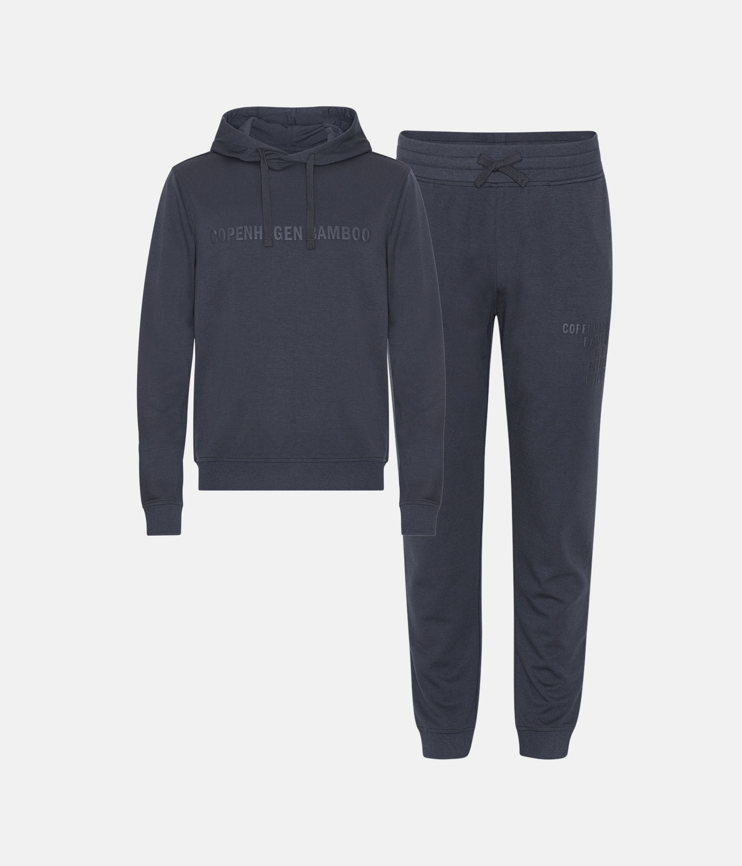 Dark grey jogging set consisting of sweatpants and hoodie. Both pieces are made of bamboo viscose, organic cotton and polyester. The sweatpants have zippered pockets, so your wallet and keys won't fall out during the day.